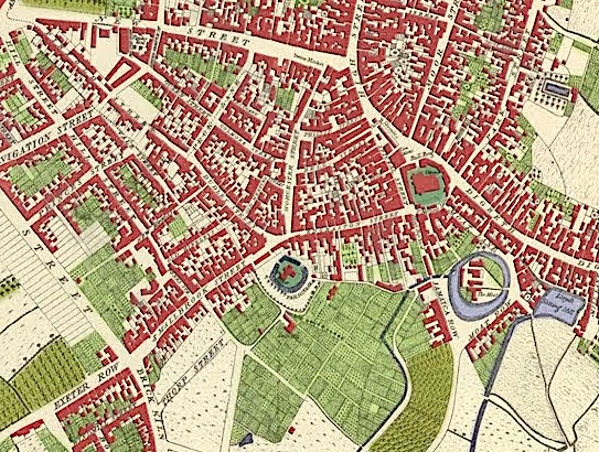 The passage which became Hurst Street is shown but not named in Bradford’s map of 1750. By the time of Hanson’s map of 1778, the nearby Thorp Street has been cut, but gardens dominated the area between the future Hurst Street and the back of Edgbaston Street and Jamaica Row.