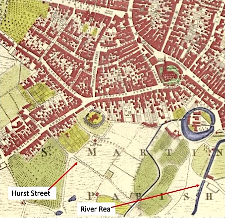 The passage which ultimately became Hurst Street is shown but not named in Samuel Bradford’s map of 1750, and it continues as a country lane which eventually leads to the River Rea. Today, as a result of urbanisation and re-routing, Bishop Street, Barford Street and Rea Street separate the end of Hurst Street and the river, which is now housed in deep culverts, and can only be viewed from the occasional road bridge.