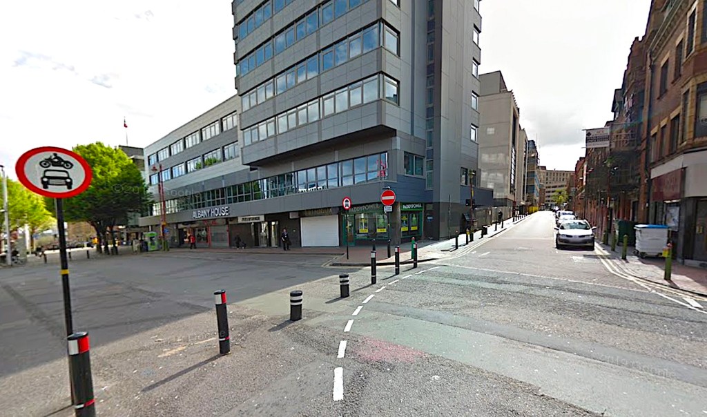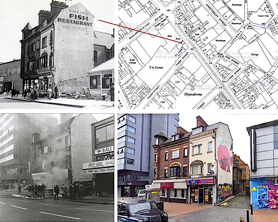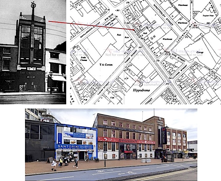 In the 1950s the buildings between Thorp Street and the Hippodrome Theatre had been demolished following bomb damage during the second world war. Seen here is the devastation caused to the buildings. In the early 1950s Hippodrome Motors occupied some of the site. Then we can see the frame of the replacement building which was under construction and the finished article. Universal Sewing Machines were occupying the new building by 1956. It seems that within 10 years it was (long) overdue for replacement and the result is seen with its original aggregate cladding in 2011 and grey cladding (to cheer us up?) in 2019. This is a critical comment regarding the 11 storey Albany House taken from an architectural website: “Designed by Marshman & Warren, this office building was built between 1963 and 1965. It is ugly and the facade consists of aggregate.” Perhaps they hadn’t seen its predecessor!