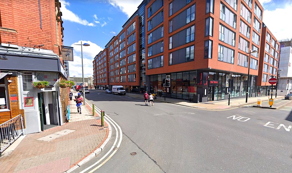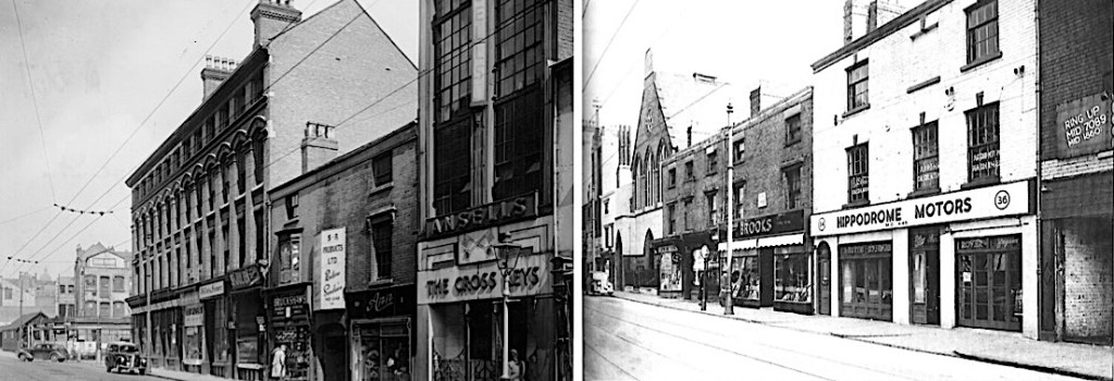 We’ll just pause to take a pictorial “THEN & NOW” journey along Hurst Street in the 1950s starting with The Cross Keys pub. This was on the left hand side of the road, just two doors from the Unitarian Chapel. The whole of this side of Hurst Street to Ladywell Walk was redeveloped in the early 1960s when Smallbrook Ringway (Queensway) was created. The Cross Keys stood where the restaurant on the left is in the 2020 photograph. Below is the Cross Keys in 1933 and 2020 along with the 1950 map.