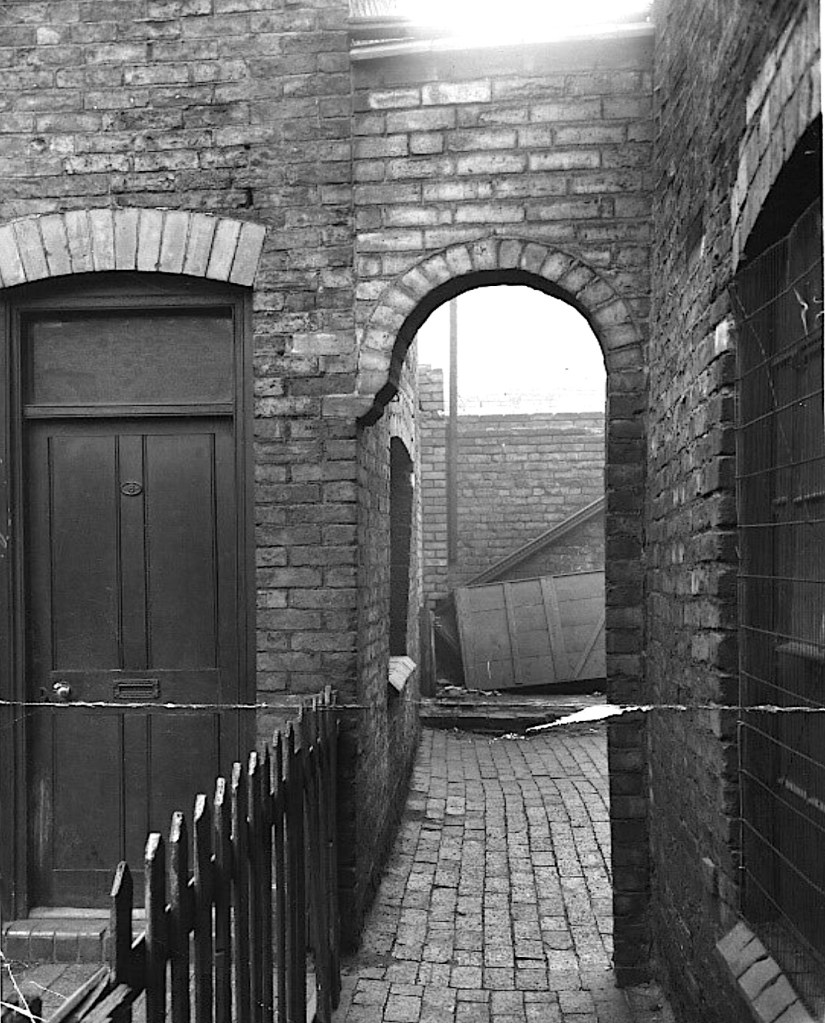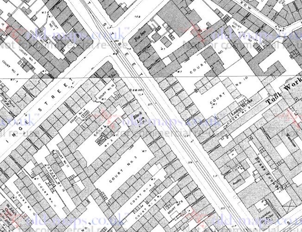 There appear to have been about 28 courts of back-to-back houses in Hurst Street as of the year 1900. However the majority had vanished by 1950. Many of the original ones seem to have become shops or small workshops over time and more had been demolished to make way for factories. Here is the archway into a Hurst Street court and Court 10 Hurst Street which was still standing in 1950. It was opposite the Black Lion pub as can be seen in the map from 1889. We will go elsewhere to look at the National Trust’s Birmingham Back to Backs which is Court 15 Inge Street.
