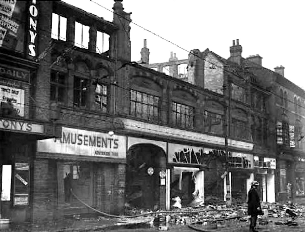 Tony’s was situated next to the Hippodrome, and the entrance was incorporated into the theatre buildings in the 1920’s under the new name “Tony’s Dance Hall”. A car dealership was located on the ground floor. Between the dance hall building and the corner of Thorp Street were three shops and The Rodney pub. During the bombing raid in December 1940 the dance hall suffered a direct hit, but the theatre, the pub and the three shops survived.