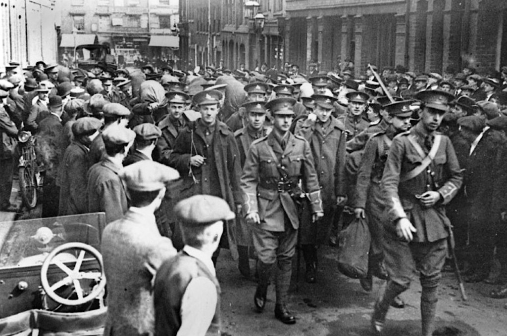 The 1/16th Warwicks Territorials leaving Thorp Street Drill Hall in 1914