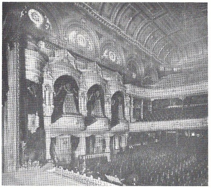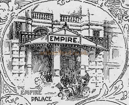 A contemporary description told us: The new auditorium is very large and well proportioned, and capable of accommodating about 3,000 persons. A very handsome facade in rich Italian renaissance, faced with red brick, with stone and cement-dressing, has been erected. This new building contains the entrances, staircases, retiring and dressing rooms, offices, and saloons. The principal entrance to the fauteuils and balcony is in the centre of the block. A large and handsome iron shelter covers the pavement, decorated in cream and gold, with rich coloured glass. Over this entrance is the directors’ room, above which is a richly carved scroll pediment containing the words “Empire Palace” surmounted by a lyre and flanked with groups of life-size statuary representing music and dancing. At the ends of the facade are large gables containing carved panels symbolical of the Arts.