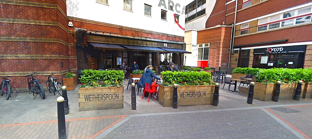 Next to The Dragon Inn and its outside seating area is a footpath called Hurst Walk that leads to The Arcadian central Piazza.