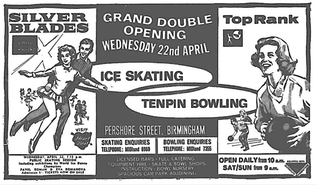 The “Silver Blades” was opened in 1965 by Mecca and this was the name given to the skating rink which was the training ground for many a championship skater. On the ground floor was the Top Rank Bowl – the 10-pin bowling alley.