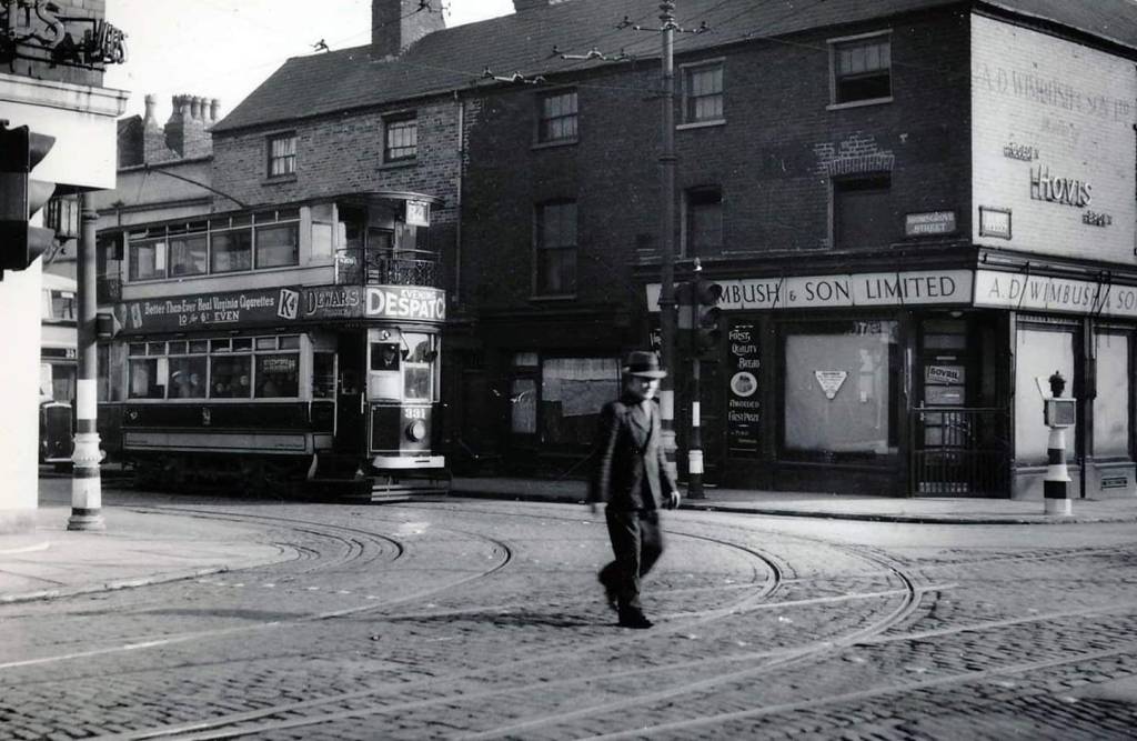 This was probably a Sunday evening as Wimbush’s on the corner was closed and the man crossing the road had been in the pub for a pint.