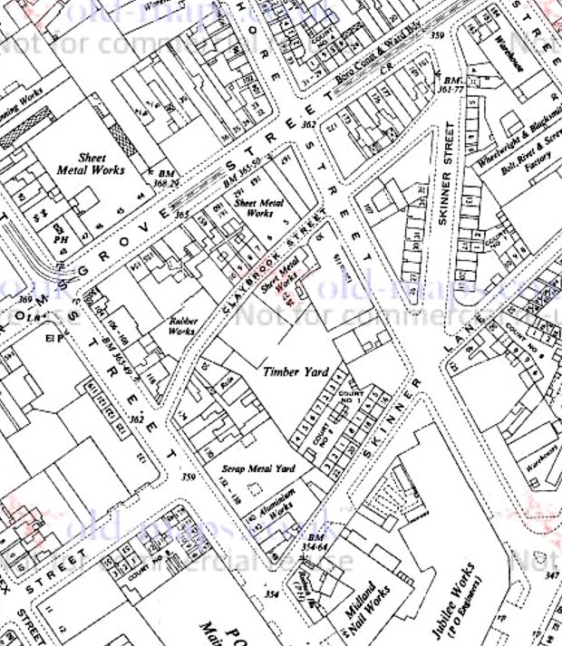 The map shows the Claybrook Street & Skinner Lane block in the 1950s. Originally this would have consisted of courts of back to back houses, of which two in Skinner Lane remained, and terraced houses, some of which were still evident on Hurst Street. Over the years these have been converted into business premises or demolished to make way for factories and warehouses. In the centre for instance is the Timber Yard that gave the new development its name. The timber yard was accessed from Pershore Street and belonged to T Jameson & Son (Timber) Ltd.