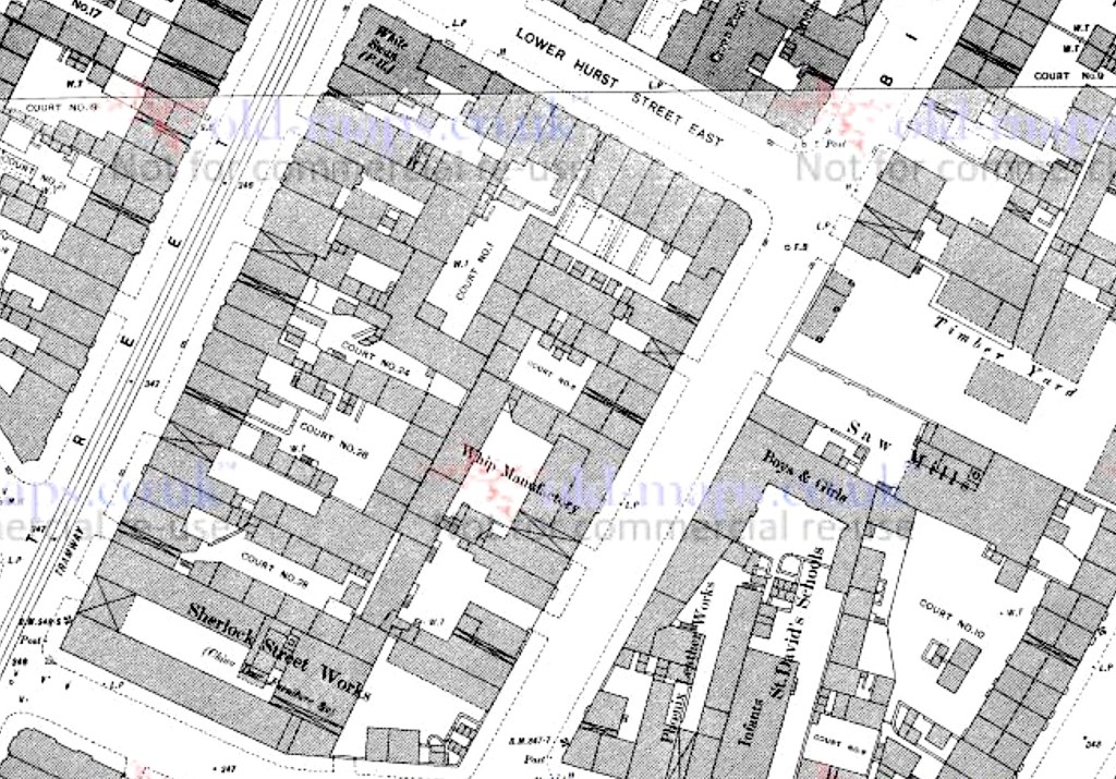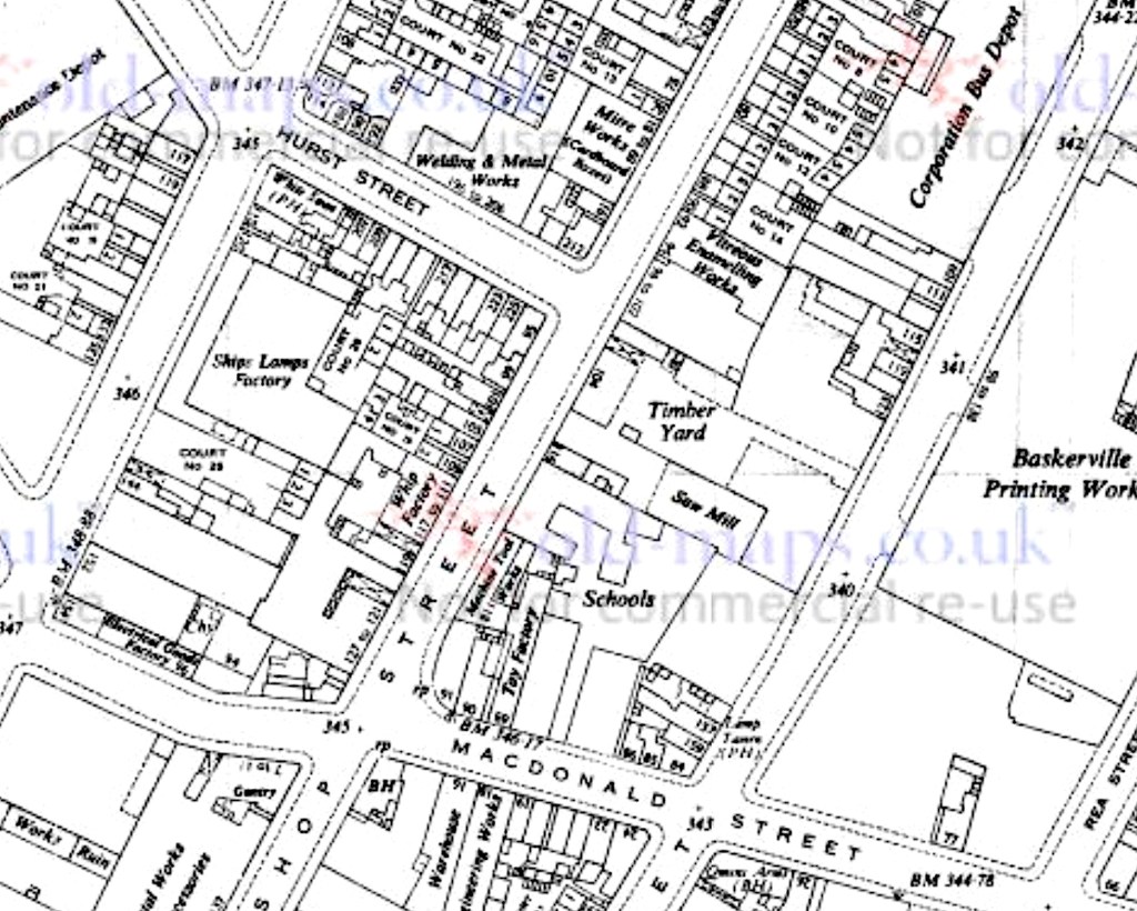 Another factory that has stood the test of time is nos 111-117 which is just visible to the left in 2021 photograph near the top of the page, taken from the corner with Hurst Street. On the map from 1889 the occupier is shown as a Whip Manufacturer, possibly very common at the end of the 19th century. However it comes as a surprise that they are still listed as trading in 1966! Their factory probably dates from late Victorian times and is still standing. The company was listed as George & John Zair – Whip Manufacturers. By 2011 it was being used as a business centre called Zair Business Centre and by 2021 it was home to a takeaway burger bar and a fitness centre (a certain mutual benefit there, I think!).
