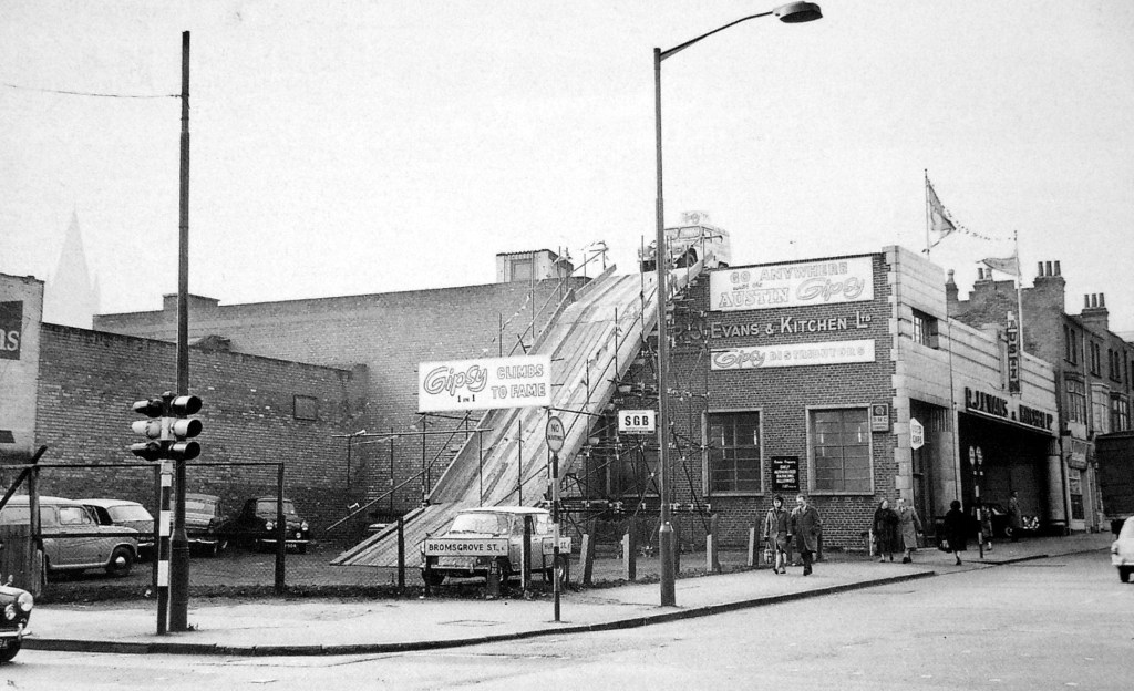 The top photograph on this page was taken looking at the north-west corner of the Hurst Street/Bromsgrove Street corner in 1960, during a publicity stunt for the Austin Gipsy. With Land Rover having such a hold on the market, it was difficult for the Gipsy to be recognised a serious competitor. Various publicity stunts were carried out to arouse public interest. Evans & Kitchen had this 1 in 1 slope built to prove that the Gipsy was a serious competitor. It attracted good media publicity, but the police were not keen as they felt that motorists would be distracted seeing the Gipsy on the roof, or driving up & down the ramp. So after a few weeks it was all removed. It is said that the Gipsy never actually drove up this ramp – it was taken up and lowered by crane.