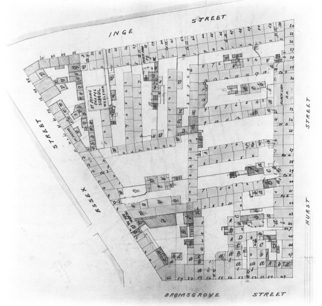 This plan of the block was created in 1895 at the time when the buildings were about 100 years old, by the new city council for the purpose of collecting rates. There appear to be 22 courts of back to back houses of varying sizes each with their “brew’us” and privies. It is roughly estimated that at least 1,000 people could have been living in the houses on the block at any one time. By the time that this plan was created many of the ground floor rooms of the houses facing the street would have been converted into shops, or other small businesses.
