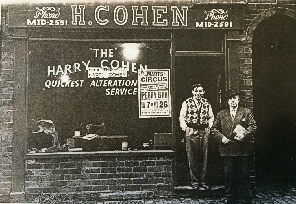 This is a great photograph of Harry Cohen (left) standing outside his tailors shop at 54 Inge Street in 1953. Harry called himself “tailor to the stars”. He probably was, as many of the famous acts appearing at the Hippodrome would visit or send their stage costumes to his shop for alteration or repair. The ceiling of his reception was covered with black and white photographs of all of the variety stars who had paid Harry a visit over the years. The premises are now part of the Back to Backs.