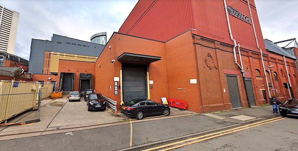 The loading bay is to the left of the site of the Mission Hall seen here which stood behind the Hippodrome until the 1980s when the stage was extended to make it the largest outside of London. This is the Inge Street side of the theatre today (2021).